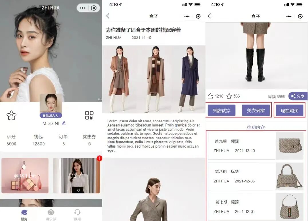 “配装”功能打破了这种限制,通过数据分析+导购对高净顾客的了解,进行个性化定制,能为顾客量身定制搭配,并以特制盒子形式送到他们手中。顾客试穿后只需选择满意的衣服直接下单购买,其余不合适的衣物可轻松退回。这种个性化服务让高净值顾客提供了符合消费者喜好和需求的搭配方案,以及与众不同的购物体验。