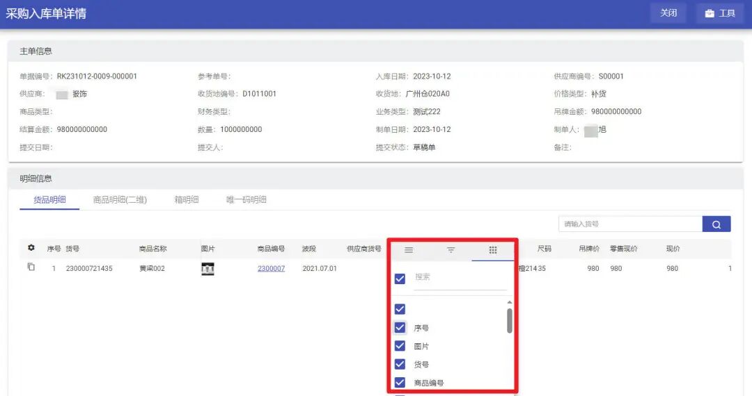 另,每一张单据的字段还设置了筛选功能,可快速、高效地定位到所需信息,辅助使用者快速做判断和决策。